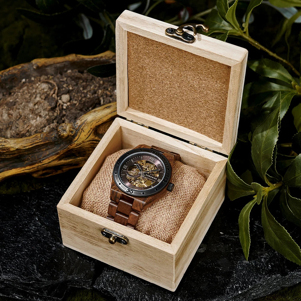 Jede Uhr wird aus echtem Holz gefertigt, mit einem japanischen Handaufzugswerk ausgestattet und in einer edlen Holzbox geliefert – das ideale Geschenk für Männer mit Stil und Charakter.