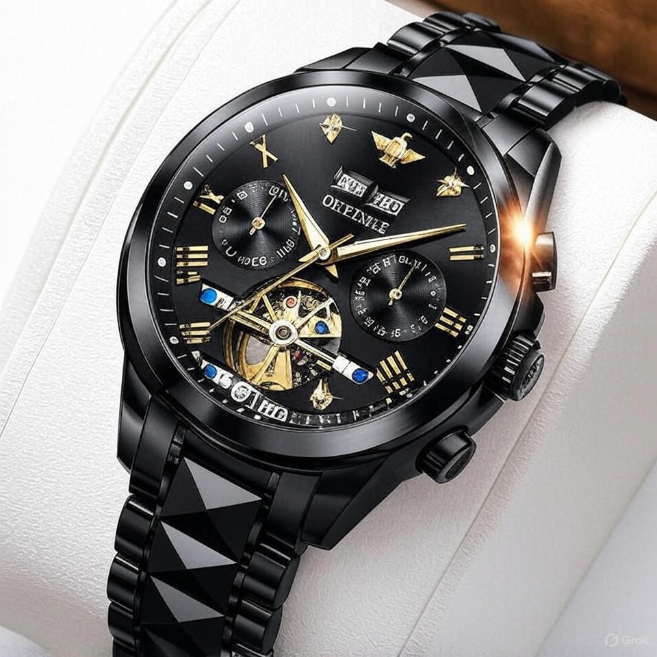 Die „Opinke“ ist eine luxuriöse Business‑Herrenuhr mit offenem Zifferblatt, die mechanische Präzision und markantes Design vereint. Das skelettierte Automatikwerk wird durch ein kratzfestes Saphirglas geschützt, während das Edelstahlarmband mit Doppel‑Butterfly‑Faltschließe sicheren Halt und hohen Tragekomfort bietet.