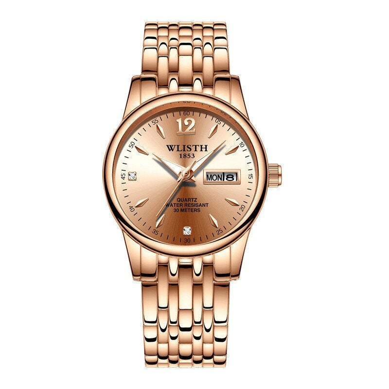 Die WLISTH 1853 Damen Quarzuhr vereint luxuriöses Design, präzise Technik und Alltagstauglichkeit. Das edle Roségold-Edelstahlarmband und das feine Zifferblatt mit Kalender- und Wochenanzeige setzen stilvolle Akzente. Luminova-Zeiger garantieren klare Ablesbarkeit auch im Dunkeln. Ideal für Frauen, die Business, Freizeit und besondere Anlässe mit einer eleganten Uhr kombinieren möchten – auch als Partneruhr erhältlich.